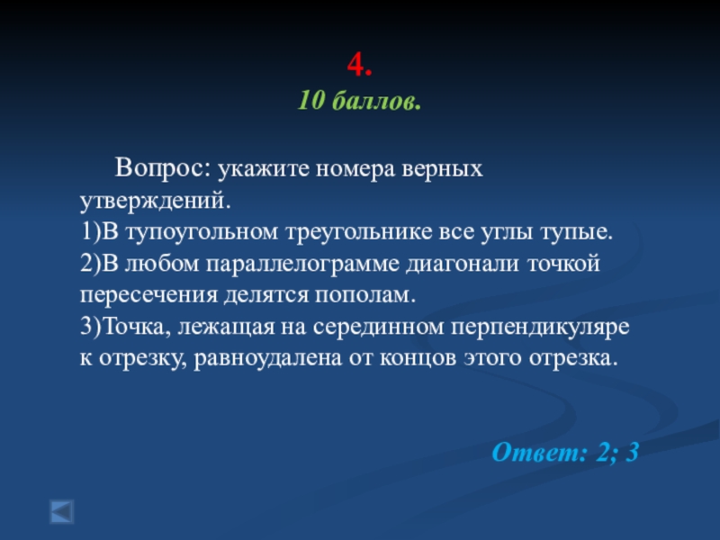 4.  10 баллов.   Вопрос: укажите номера верных утверждений.1)В тупоугольном треугольнике все углы тупые.2)В