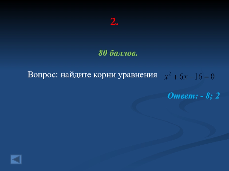 2.80 баллов.   Вопрос: найдите корни уравненияОтвет: - 8; 2
