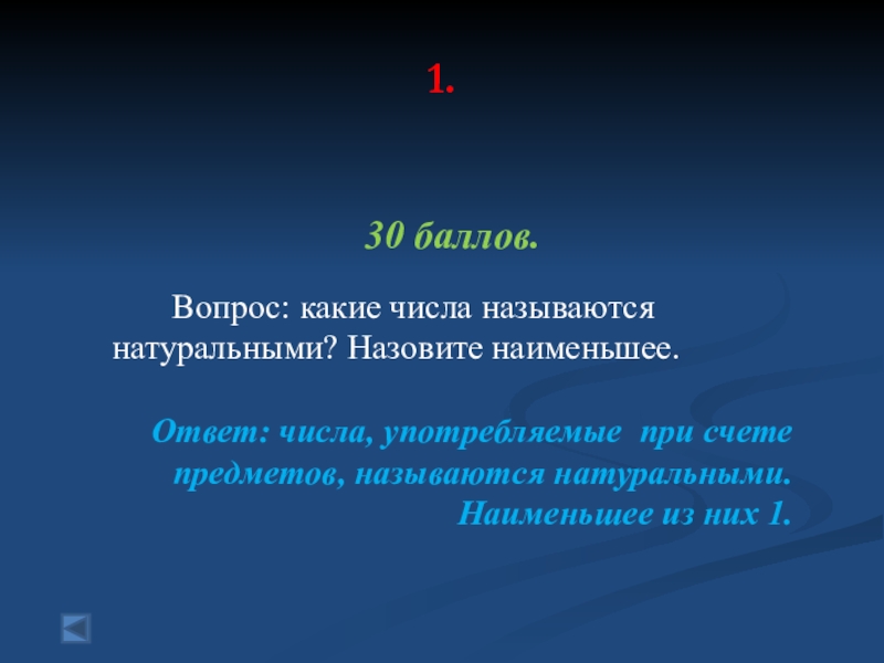 1. 30 баллов.    Вопрос: какие числа называются натуральными? Назовите наименьшее.Ответ: числа, употребляемые при