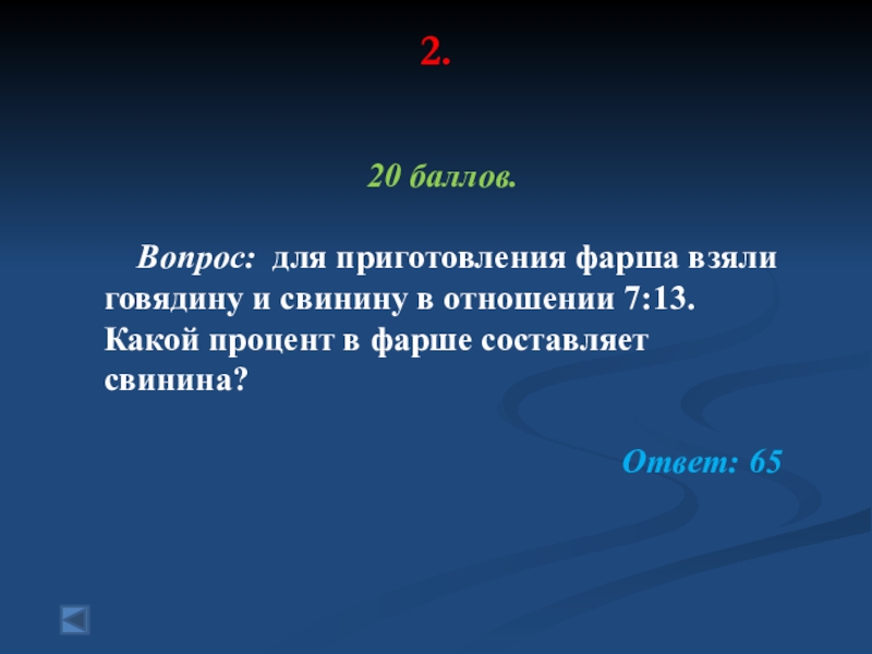 2.  20 баллов.   Вопрос: для приготовления фарша взяли говядину и свинину в отношении 7:13.