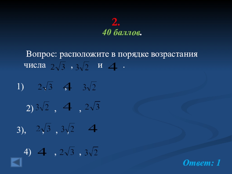 2. 40 баллов. Вопрос: расположите в порядке возрастания числа      ,