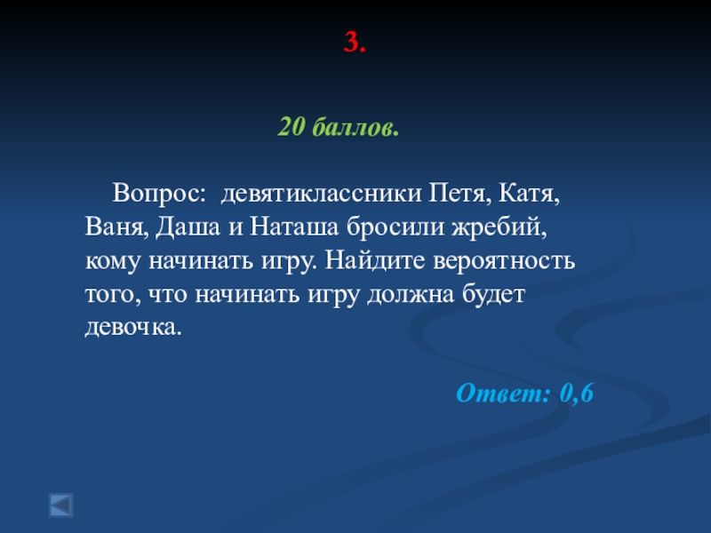 3.  20 баллов.   Вопрос: девятиклассники Петя, Катя, Ваня, Даша и Наташа бросили жребий, кому