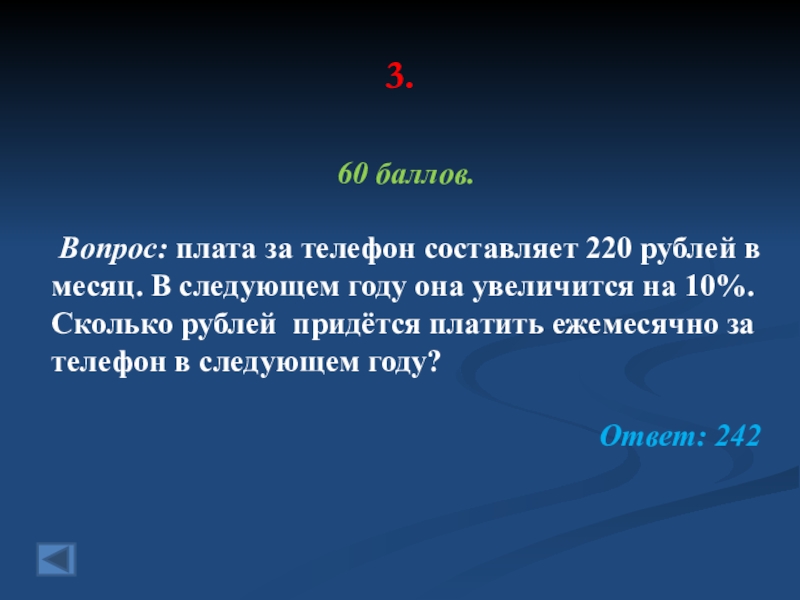 3. 60 баллов. Вопрос: плата за телефон составляет 220 рублей в месяц. В следующем году она увеличится