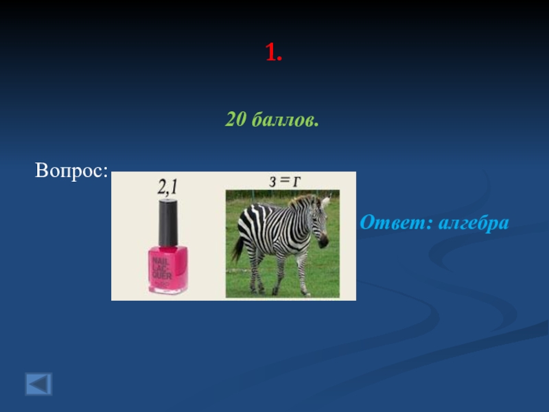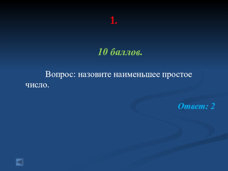 1.  10 баллов.     Вопрос: назовите наименьшее простое число.Ответ: 2