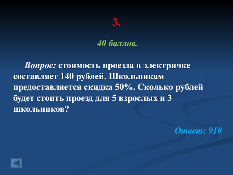 3. 40 баллов.   Вопрос: стоимость проезда в электричке составляет 140 рублей. Школьникам предоставляется скидка 50%.