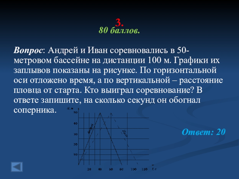 3. 80 баллов. Вопрос: Андрей и Иван соревновались в 50-метровом бассейне на дистанции 100 м. Графики их