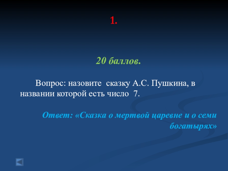 1.  20 баллов.    Вопрос: назовите сказку А.С. Пушкина, в названии которой есть