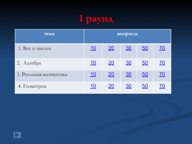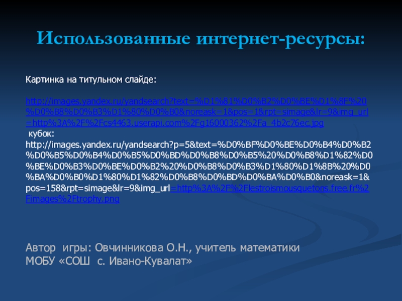Использованные интернет-ресурсы:Картинка на титульном слайде: http://images.yandex.ru/yandsearch?text=%D1%81%D0%B2%D0%BE%D1%8F%20%D0%B8%D0%B3%D1%80%D0%B0&noreask=1&pos=1&rpt=simage&lr=9&img_url=http%3A%2F%2Fcs4463.userapi.com%2Fg16000362%2Fa_4b2c76ec.jpg  кубок: http://images.yandex.ru/yandsearch?p=5&text=%D0%BF%D0%BE%D0%B4%D0%B2%D0%B5%D0%B4%D0%B5%D0%BD%D0%B8%D0%B5%20%D0%B8%D1%82%D0%BE%D0%B3%D0%BE%D0%B2%20%D0%B8%D0%B3%D1%80%D1%8B%20%D0%BA%D0%B0%D1%80%D1%82%D0%B8%D0%BD%D0%BA%D0%B0&noreask=1&pos=158&rpt=simage&lr=9&img_url=http%3A%2F%2Flestroismousquetons.free.fr%2Fimages%2Ftrophy.pngАвтор игры: Овчинникова О.Н., учитель математикиМОБУ «СОШ с. Ивано-Кувалат»
