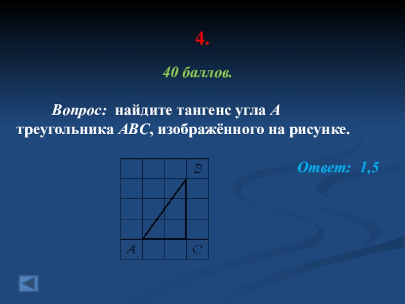 4. 40 баллов.     Вопрос: найдите тангенс угла А треугольника ABC, изображённого на рисунке.Ответ: