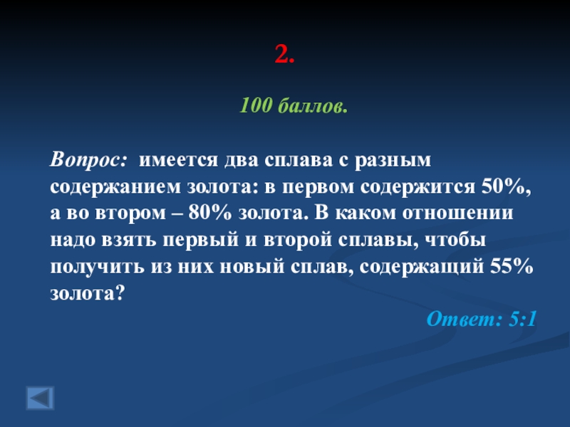 2. 100 баллов. Вопрос: имеется два сплава с разным содержанием золота: в первом содержится 50%, а во
