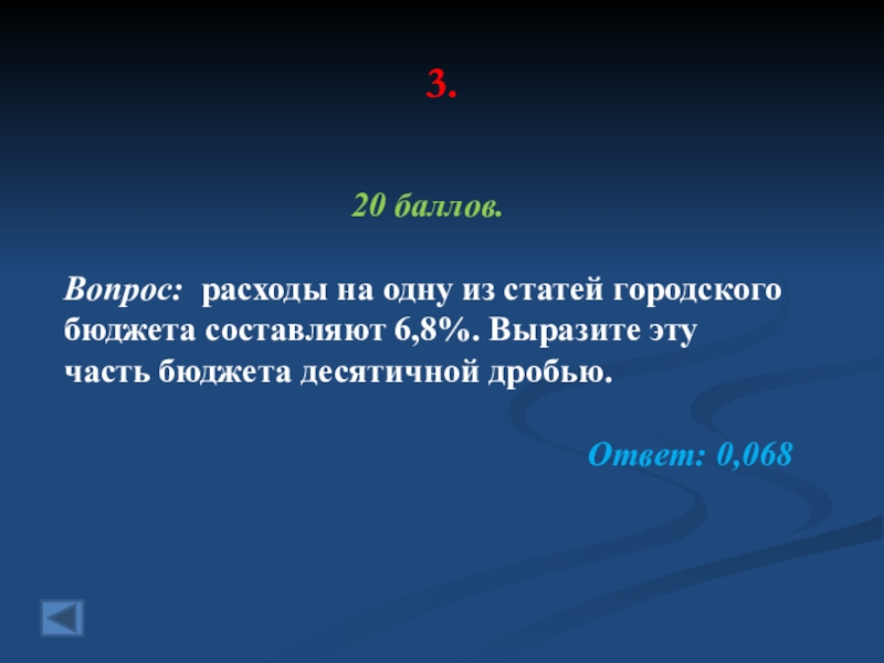 3. 20 баллов. Вопрос: расходы на одну из статей городского бюджета составляют 6,8%. Выразите эту часть бюджета