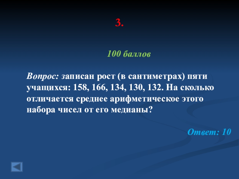 3. 100 балловВопрос: записан рост (в сантиметрах) пяти учащихся: 158, 166, 134, 130, 132. На сколько отличается