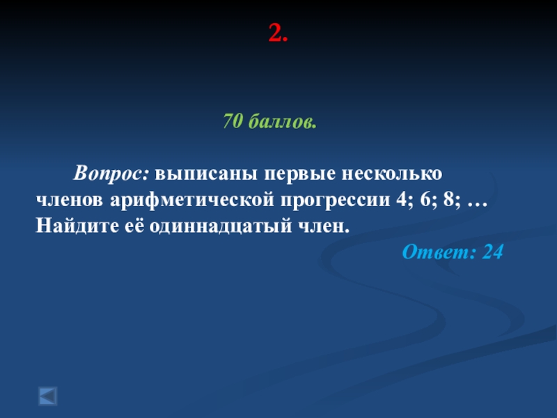 2.  70 баллов.    Вопрос: выписаны первые несколько членов арифметической прогрессии 4; 6; 8;
