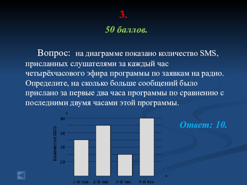 3.  50 баллов.   Вопрос: на диаграмме показано количество SMS, присланных слушателями за каждый час