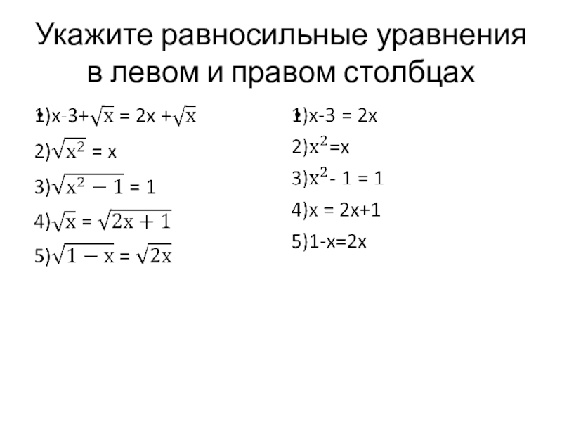 Слайд 3Укажите равносильные уравнения в левом и правом столбцах