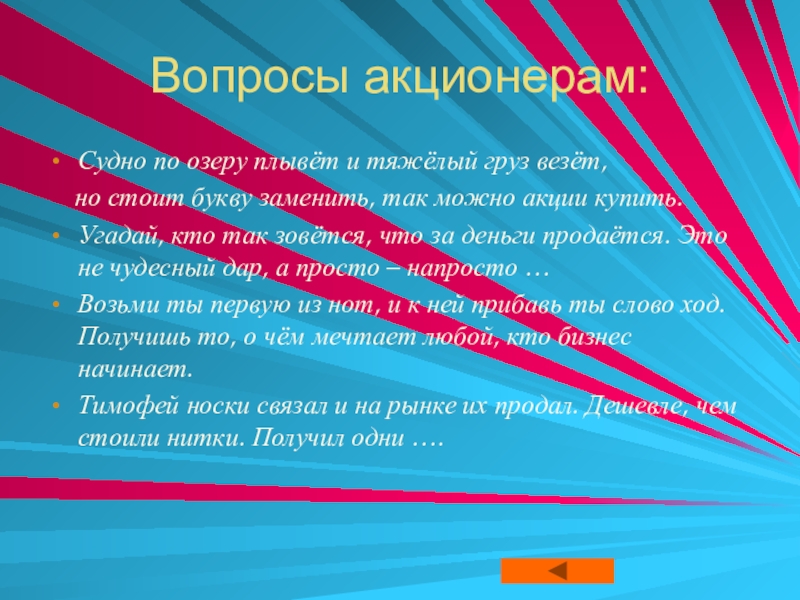 Это сайт презентаций, где можно хранить и обмениваться своими презентациями, докладами, проектами, шаблонами в формате PowerPoint с другими пользователями. Мы помогаем школьникам, студентам, учителям, преподавателям хранить и обмениваться учебными материалами.