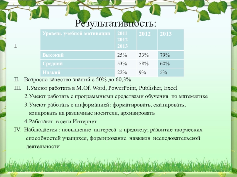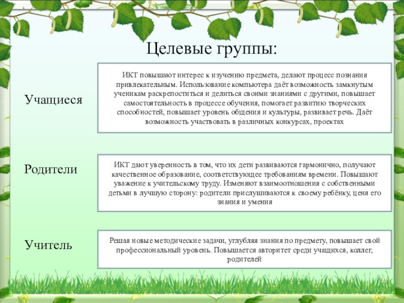 ИКТ дают уверенность в том, что их дети развиваются гармонично, получают качественное образование, соответствующее требованиям времени. Повышают уважение к учительскому труду. Изменяют взаимоотношения с собственными детьми в лучшую сторону: родители прислушиваются к своему ребёнку, ценя его знания и умения