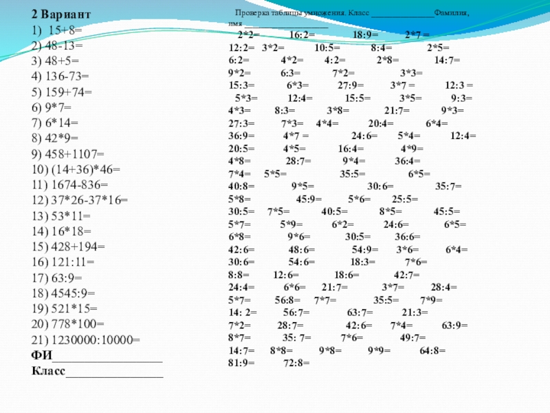 Проверка таблицы умножения. Класс _______________Фамилия, имя ____________________