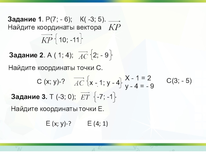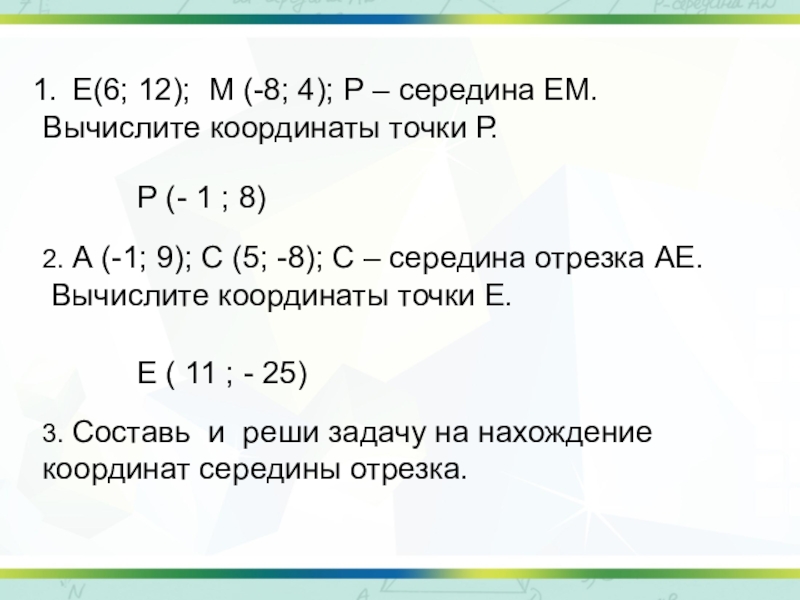 2. А (-1; 9); С (5; -8); С – середина отрезка АЕ.