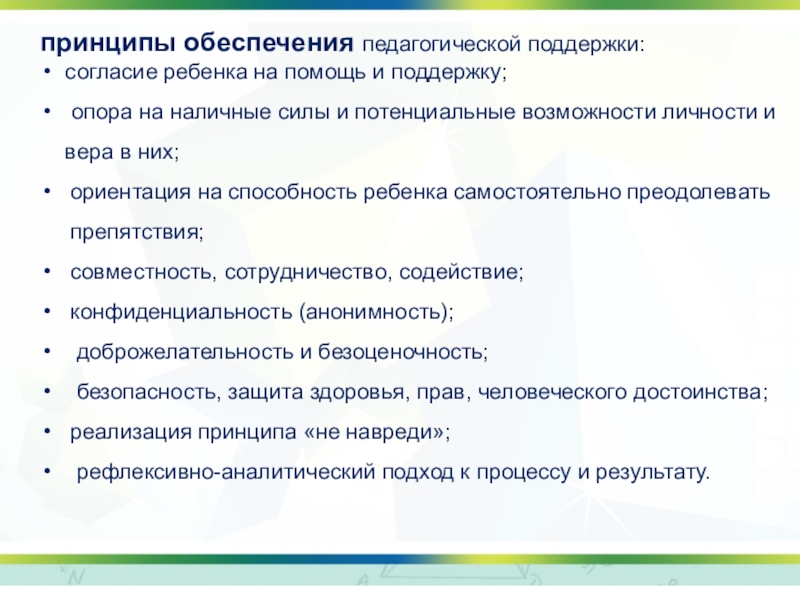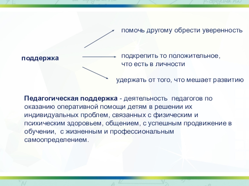Педагогическая поддержка - деятельность педагогов по оказанию оперативной помощи детям в решении их индивидуальных проблем, связанных с физическим и психическим здоровьем, общением, с успешным продвижение в обучении, с жизненным и профессиональным самоопределением.