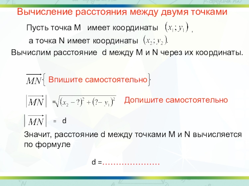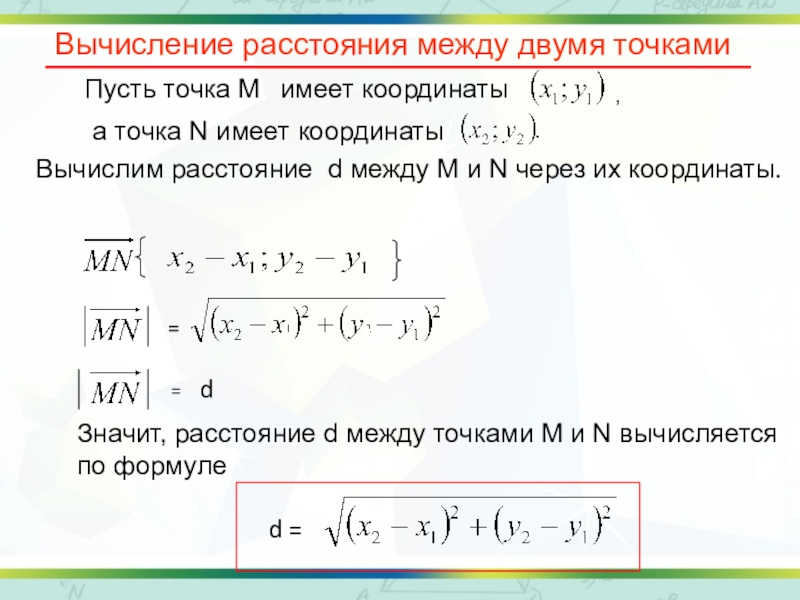 Значит, расстояние d между точками М и N вычисляется по формуле