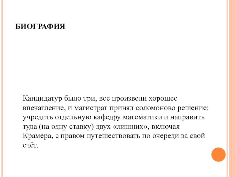 способности в области математики. В 18 лет защитил диссертацию. В 20-летнем возрасте Крамер выставил свою кандидатуру на вакантную должность преподавателя на кафедре философии Женевского университета.