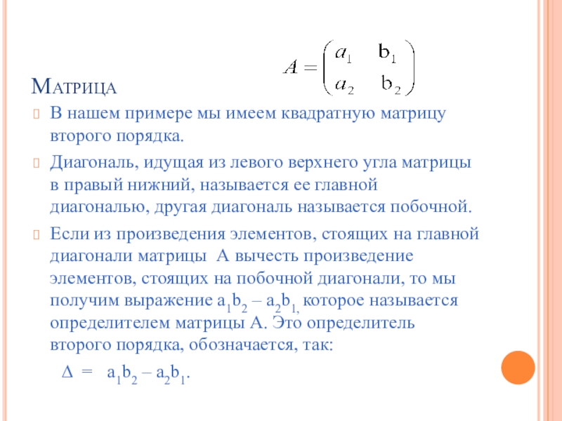 Если из произведения элементов, стоящих на главной диагонали матрицы А вычесть произведение элементов, стоящих на побочной диагонали, то мы получим выражение a1b2 – a2b1, которое называется определителем матрицы А. Это определитель второго порядка, обозначается, так: