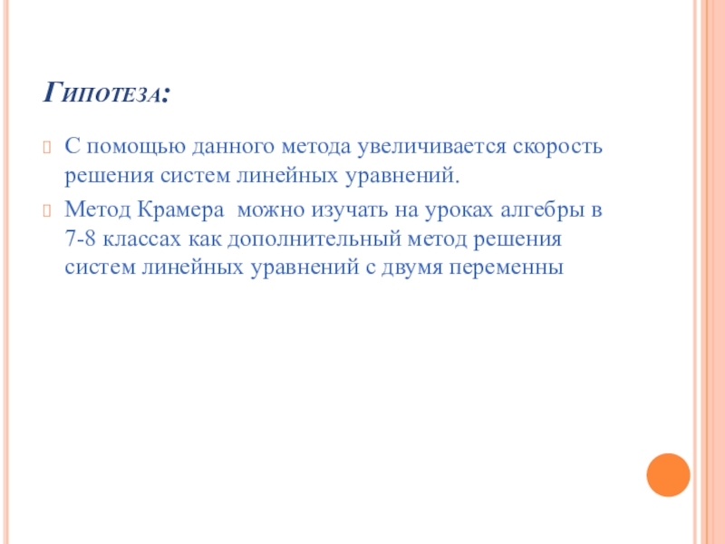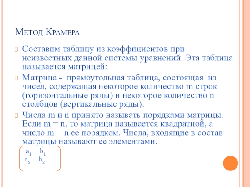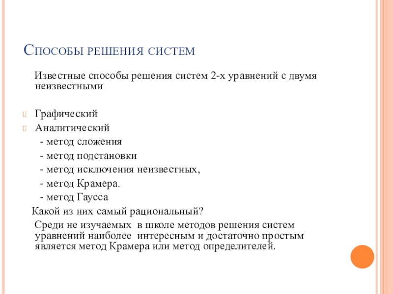 Среди не изучаемых в школе методов решения систем уравнений наиболее интересным и достаточно простым является метод Крамера или метод определителей.
