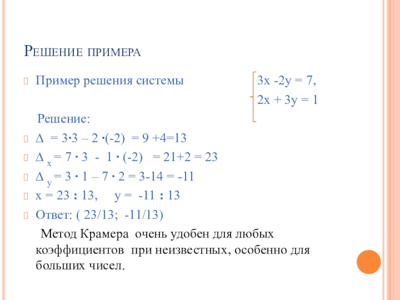 Метод Крамера очень удобен для любых коэффициентов при неизвестных, особенно для больших чисел.