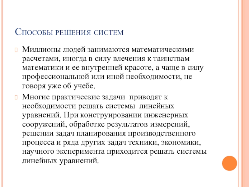 Многие практические задачи приводят к необходимости решать системы линейных уравнений. При конструировании инженерных сооружений, обработке результатов измерений, решении задач планирования производственного процесса и ряда других задач техники, экономики, научного эксперимента приходится решать системы линейных уравнений.
