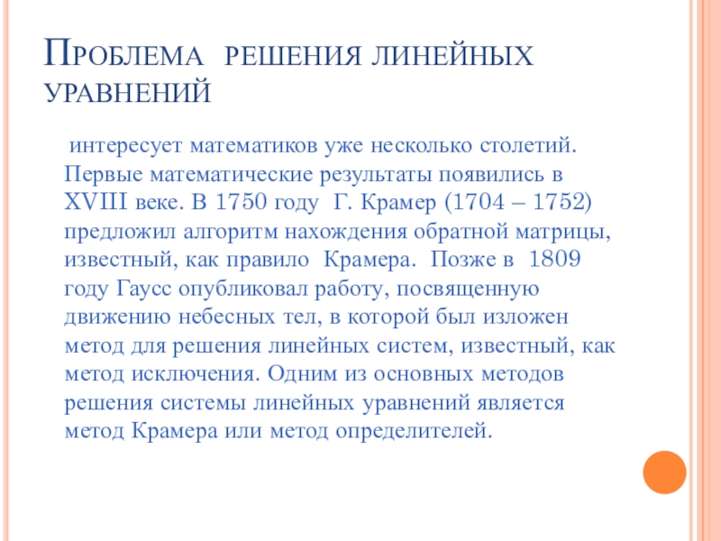 математические результаты появились в XVIII веке. В 1750 году Г. Крамер (1704 – 1752) предложил алгоритм нахождения обратной матрицы, известный, как правило Крамера. Позже в 1809 году Гаусс опубликовал работу, посвященную движению небесных тел, в которой был изложен метод для решения линейных систем, известный, как метод исключения. Одним из основных методов решения системы линейных уравнений является метод Крамера или метод определителей.