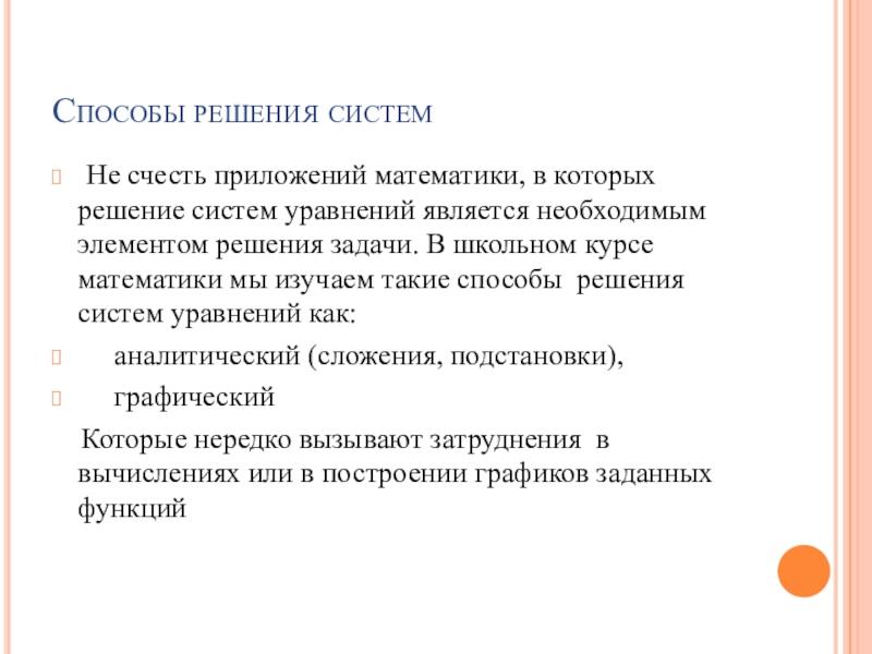 является необходимым элементом решения задачи. В школьном курсе математики мы изучаем такие способы решения систем уравнений как: