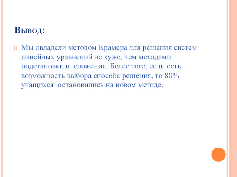чем методами подстановки и сложения. Более того, если есть возможность выбора способа решения, то 80% учащихся остановились на новом методе.