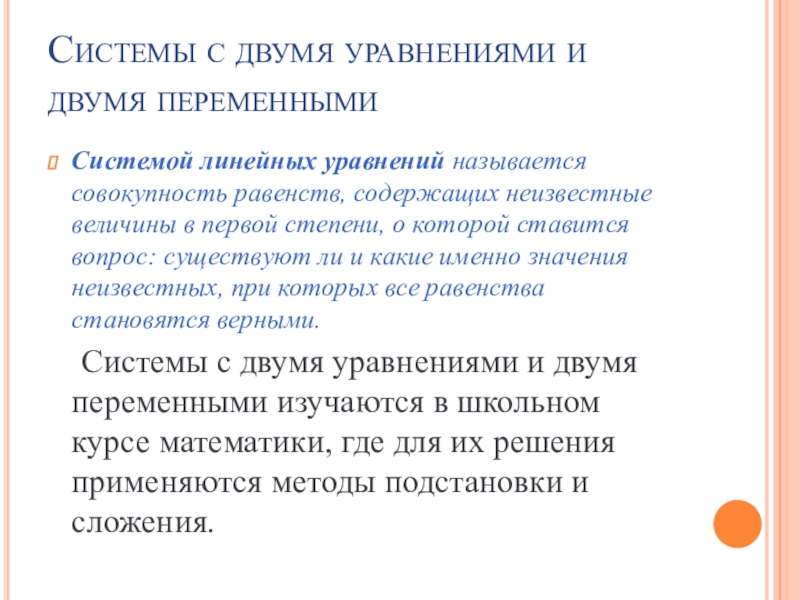 Системы с двумя уравнениями и двумя переменными изучаются в школьном курсе математики, где для их решения применяются методы подстановки и сложения.
