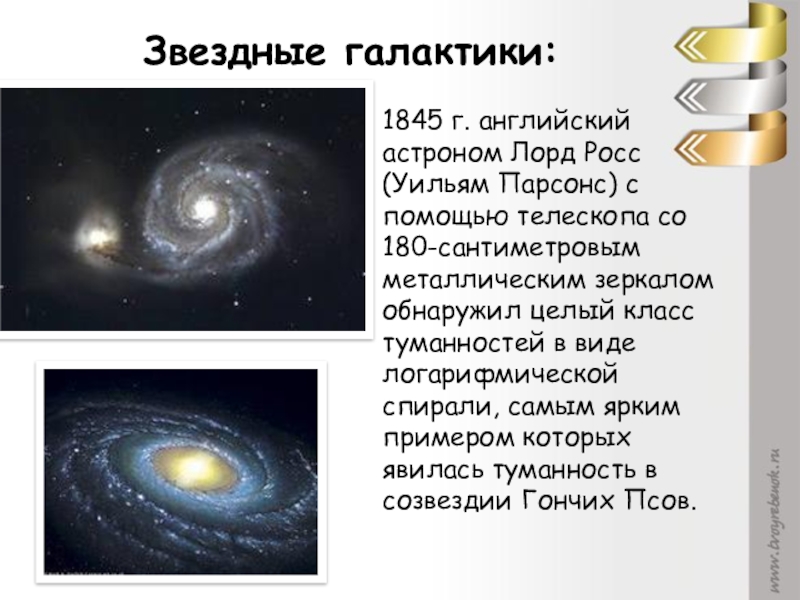 телескопа со 180-сантиметровым металлическим зеркалом обнаружил целый класс туманностей в виде логарифмической спирали, самым ярким примером которых явилась туманность в созвездии Гончих Псов.
