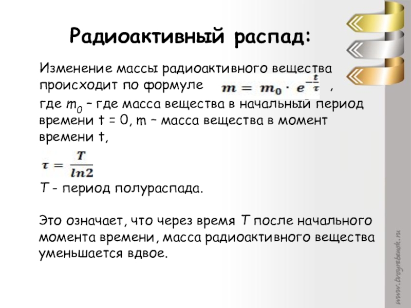 Это означает, что через время Т после начального момента времени, масса радиоактивного вещества уменьшается вдвое.