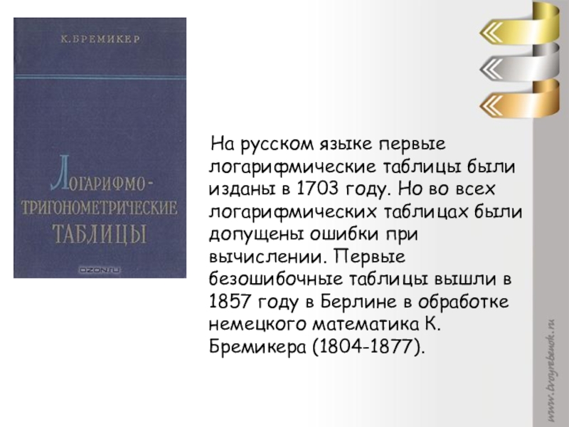 1703 году. Но во всех логарифмических таблицах были допущены ошибки при вычислении. Первые безошибочные таблицы вышли в 1857 году в Берлине в обработке немецкого математика К.Бремикера (1804-1877).