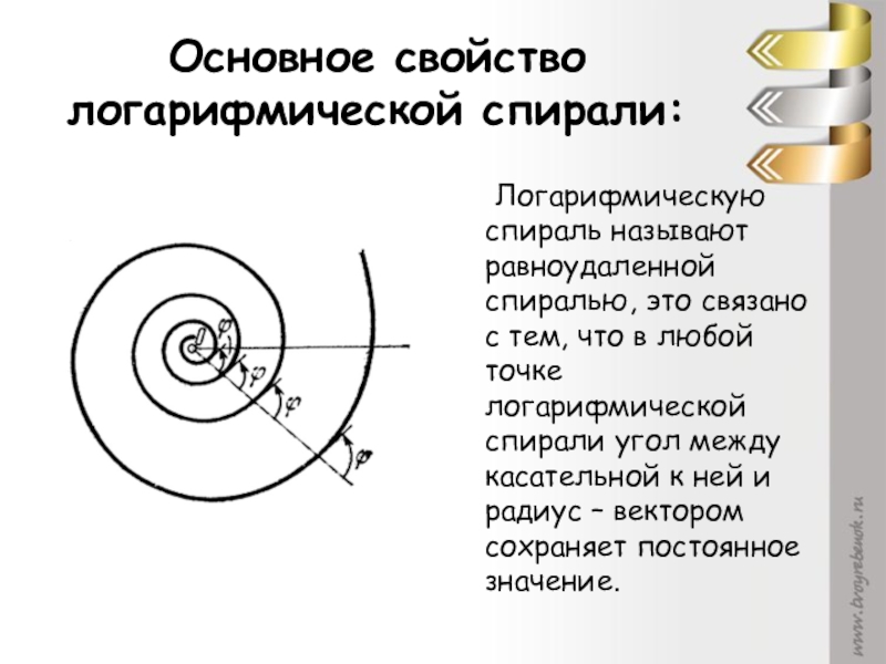 одну из точек на плоскости, эта точка называется полюсом спирали. Полюсом логарифмической спирали является начало координат. Спираль называется логарифмической, потому что уравнение, описывающее эту спираль, содержит логарифмы. Эта спираль имеет бесконечное множество витков, она не проходит через свой полюс.