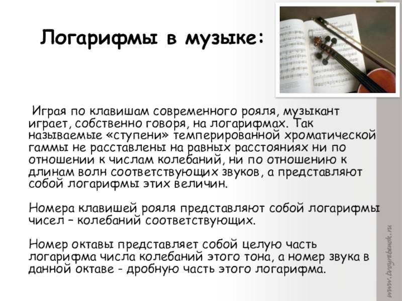 Убедились, что, играя по клавишам современного рояля, музыкант играет, собственно говоря, на логарифмах.