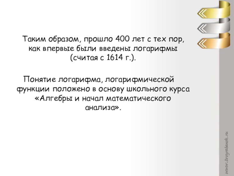 Понятие логарифма, логарифмической функции положено в основу школьного курса «Алгебры и начал математического анализа».