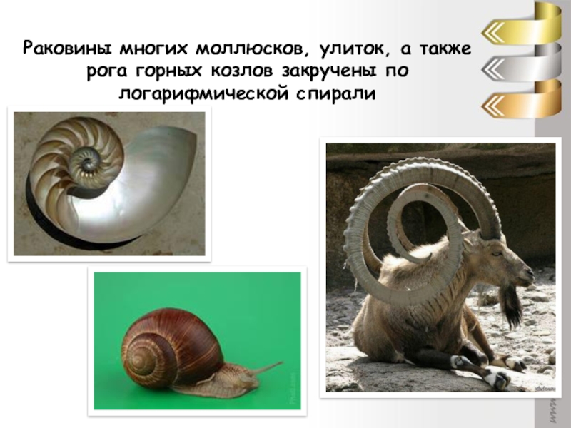 Слайд 21Раковины многих моллюсков, улиток, а также рога горных козлов закручены по