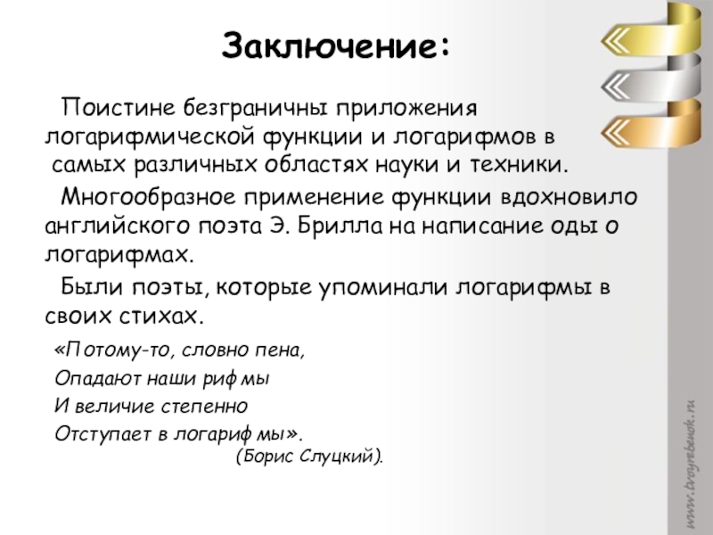 Многообразное применение функции вдохновило английского поэта Э. Брилла на написание оды о логарифмах.