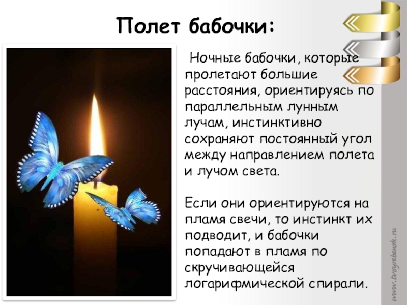 Если они ориентируются на пламя свечи, то инстинкт их подводит, и бабочки попадают в пламя по скручивающейся логарифмической спирали.