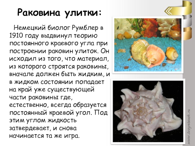 теорию постоянного краевого угла при построении раковин улиток. Он исходил из того, что материал, из которого строятся раковины, вначале должен быть жидким, и в жидком состоянии попадает на край уже существующей части раковины где, естественно, всегда образуется постоянный краевой угол. Под этим углом жидкость затвердевает, и снова начинается та же игра.
