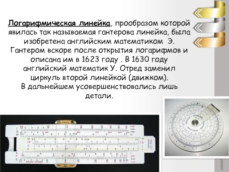 Слайд 11Логарифмическая линейка, прообразом которой явилась так называемая гантерова линейка, была изобретена