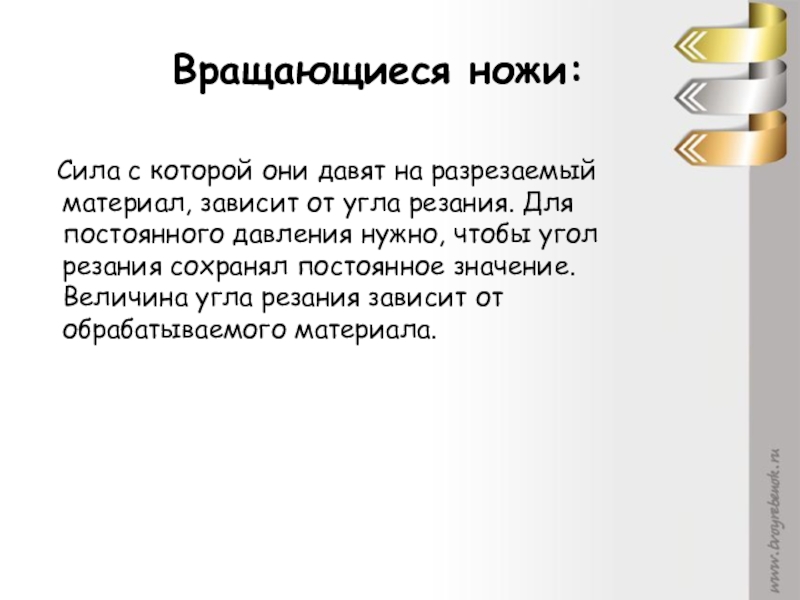 зависит от угла резания. Для постоянного давления нужно, чтобы угол резания сохранял постоянное значение. Величина угла резания зависит от обрабатываемого материала.