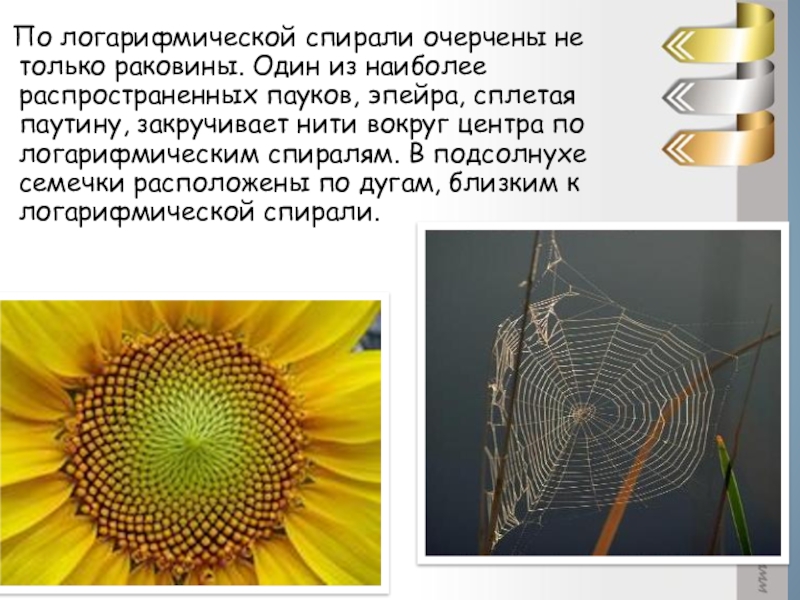 наиболее распространенных пауков, эпейра, сплетая паутину, закручивает нити вокруг центра по логарифмическим спиралям. В подсолнухе семечки расположены по дугам, близким к логарифмической спирали.