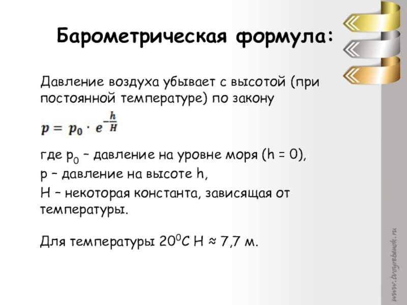 Давление воздуха убывает с высотой (при постоянной температуре)