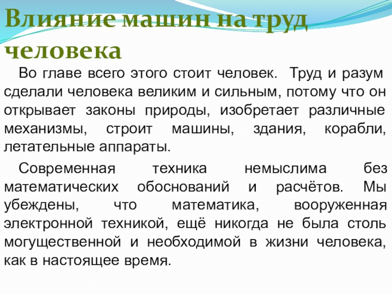 Современная техника немыслима без математических обоснований и расчётов. Мы убеждены, что математика, вооруженная электронной техникой, ещё никогда не была столь могущественной и необходимой в жизни человека, как в настоящее время.