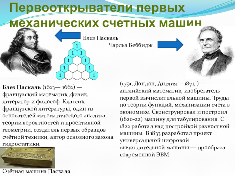 Блез Паскаль (1623— 1662) — французский математик ,физик, литератор и философ. Классик французской литературы, один из основателей математического анализа, теории вероятностей и проективной геометрии, создатель первых образцов счётной техники, автор основного закона гидростатики.